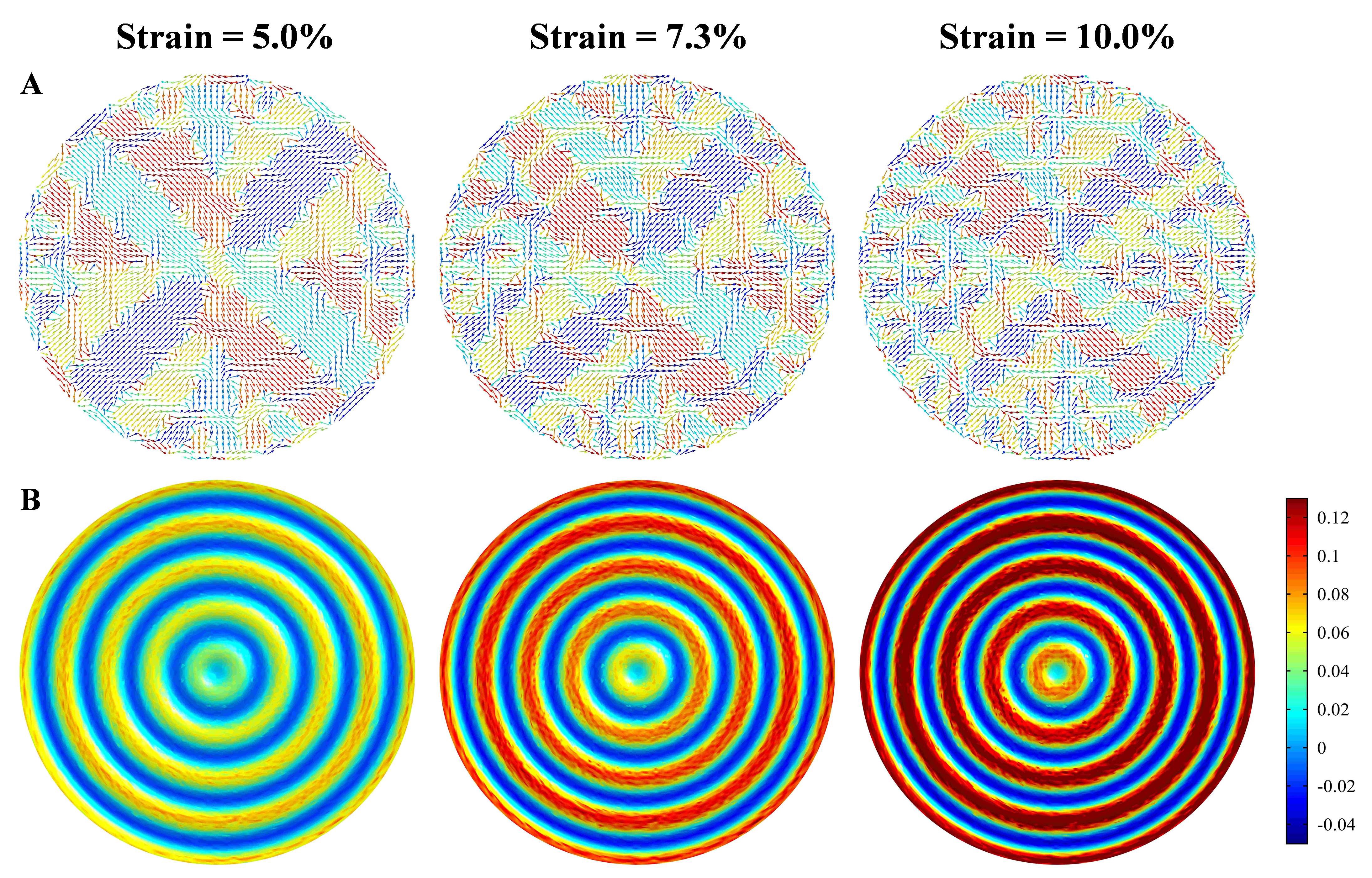 图2 P(VDF-TrFE)薄膜中环向极性拓扑应变调控的相场模拟