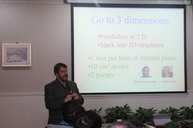 上午10时在3号楼会议室做了题名为“New Routes to Particle Synthesis: Making particles one by one”的学术报告。报告会上Weitz 教授系统介绍了自己的团队在微流控领域最新的科研课题和研究成果。他指出,使用微流体装置来精确控制流体的流量可以制造滴剂,而滴剂在实际生活中有广泛的应用,可以研制很难用任何其他方法合成的新材料。最后,Weitz教授简单介绍了该研究成果在药物封装、化妆品生产等技术上的应用。