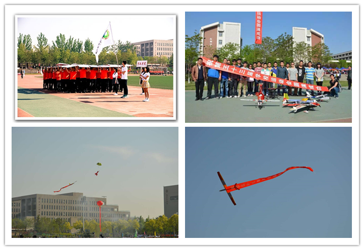 的方阵队伍迈着铿锵的步伐,高呼“长征蛟龙,舞破苍穹,宇航之志,剑指九霄”的口号走向主席台。此时,航模队操纵天空中的“精灵”华丽亮相。滑翔机在蓝天中拉展“祝第五十三届学校运动会圆满成功”的横幅,火箭腾空而起在天际划下一条长龙,教练机拉烟向全场致意。天空中的航模表演精彩纷呈,地面上的方阵队伍英姿飒爽,展现出宇航学子拼搏探索,自信昂扬的精神面貌。