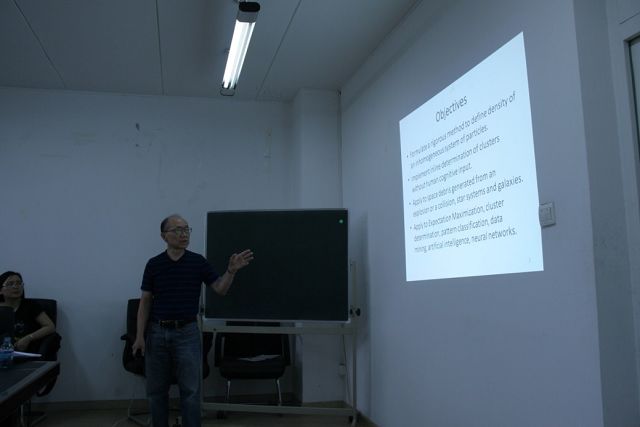Ken Chan博士的报告题目是“Density of Particles in an Inhomogeneous Distribution”。对于聚集在一个区域的粒子,虽然其分布规模比全系统小,但是仍然大于物理系统的规模,Ken Chan博士汇报了这类区域聚集系统的不均匀分布的粒子的密度描述方法,典型的例子包括航天器穿越由于碰撞或爆炸产生的空间碎片群。引入了可以定义区域密度的参数,这一参数可以用于描述高密度和低密度区域同时可以粒子的数量。