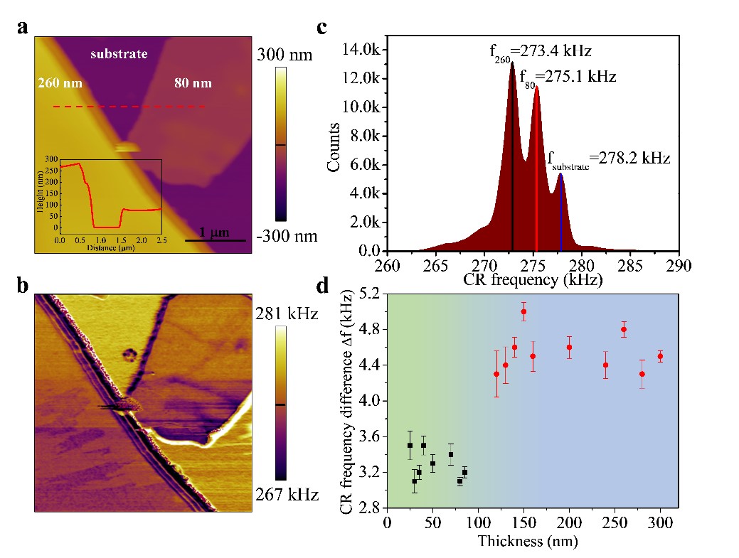 洪家旺与王学云课题组在铁电材料的研究领域具有丰富经验(Nature Physics, 10, 970-977; Phys. Rev. Lett. 112, 247201等),邓建明等人利用化学气相输运法合成了CuInP2S6单晶材料,通过压电力显微镜研究了二维材料CuInP2S6的尺寸效应诱导结构相变和铁电序参量变化。首次发现二维铁电材料CuInP2S6具有面内铁电性,在低于90 nm面内铁电极化消失(如图1所示)。刘彦昱博士与李明强分别通过第一性原理计算和透射电子显微镜表征表明,维度下降,材料的晶体结构由单斜相转变为三方相,该结构相变引发在临界尺寸以下面内铁电性消失,同时发现了杨氏模量在临界尺寸附近发生突变(如图2所示)。这些新奇的物理机制,对理解和设计纳米级电子存储器件具有非常重要意义。