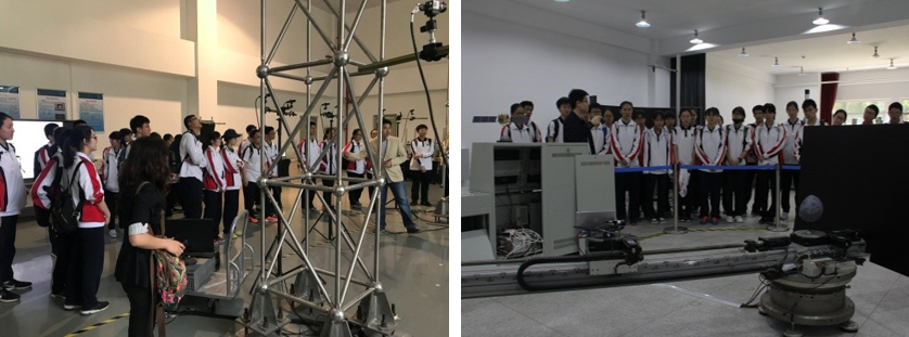 无人飞行器自主控制研究所、深空探测技术研究所及空间结构动力学与控制研究所实地参观交流。在空间结构动力学与控制研究所的交流活动中,同学们现场观看了大型可展开空间结构的展开试验,同时我校教师讲解了大型可展开空间结构的应用需求和技术挑战,并详细的回答了同学们提出的问题。
