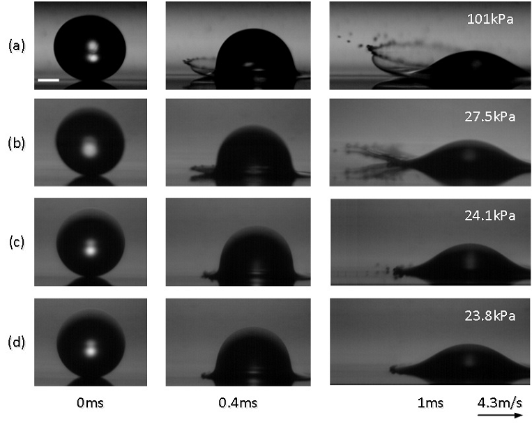 图2从图(a)到图(d)环境压力逐渐降低,非对称飞溅亦逐渐减弱并最终消失