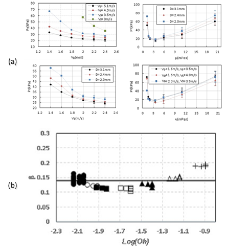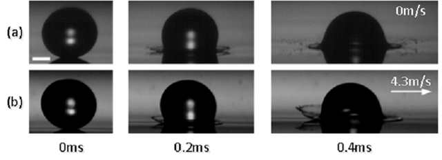 液滴飞溅现象广泛存在于自然界和一系列工农业应用中,实例包括雨滴冲击岩石土壤、超冷雨滴冲击飞机翼面成冰、3D打印、燃烧、喷涂、冷却、农药喷洒等等。根据应用场合,液滴飞溅可利可弊,在有些应用场合,如燃烧、冷却等,液滴飞溅对于增加气液接触面积是有利的,另外一些场合,如喷涂、农药喷洒、3D打印等,液滴飞溅对于液体的均匀布洒是不利的,因而对其调制的需求广泛存在。然而虽然历经逾140年的研究,即使对于液滴垂直冲击固体表面形成的对称液膜的瞬态流动机理仍未充分理解,其中液滴飞溅由于其高度瞬态的特性尤其缺乏理解,更不用提液滴非对称飞溅的流动机理。在此背景下,课题组经过大量的试验研究发现液滴在切向速度作用下形成的上游强化飞溅(图1)可以通过降低环境气体压力而得到抑制(图2),并获得了不同液滴直径、冲击速度、粘性、表面运动速度下抑制飞溅所需的临界值(图3(a));基于空气动力学解释了液滴非对称飞溅及其抑制机理,通过扩展一个最近提出的求解液滴冲击光滑静止表面后飞溅临界值的模型,使其可以包含表面运动速度的影响,成功将在一系列试验条件下获得的临界值坍缩到一条曲线上(图3(b))。