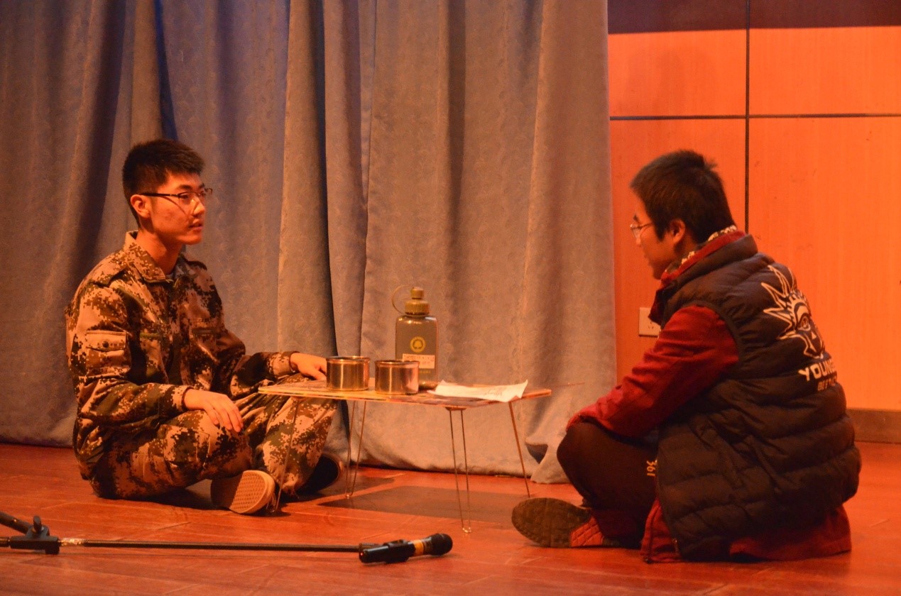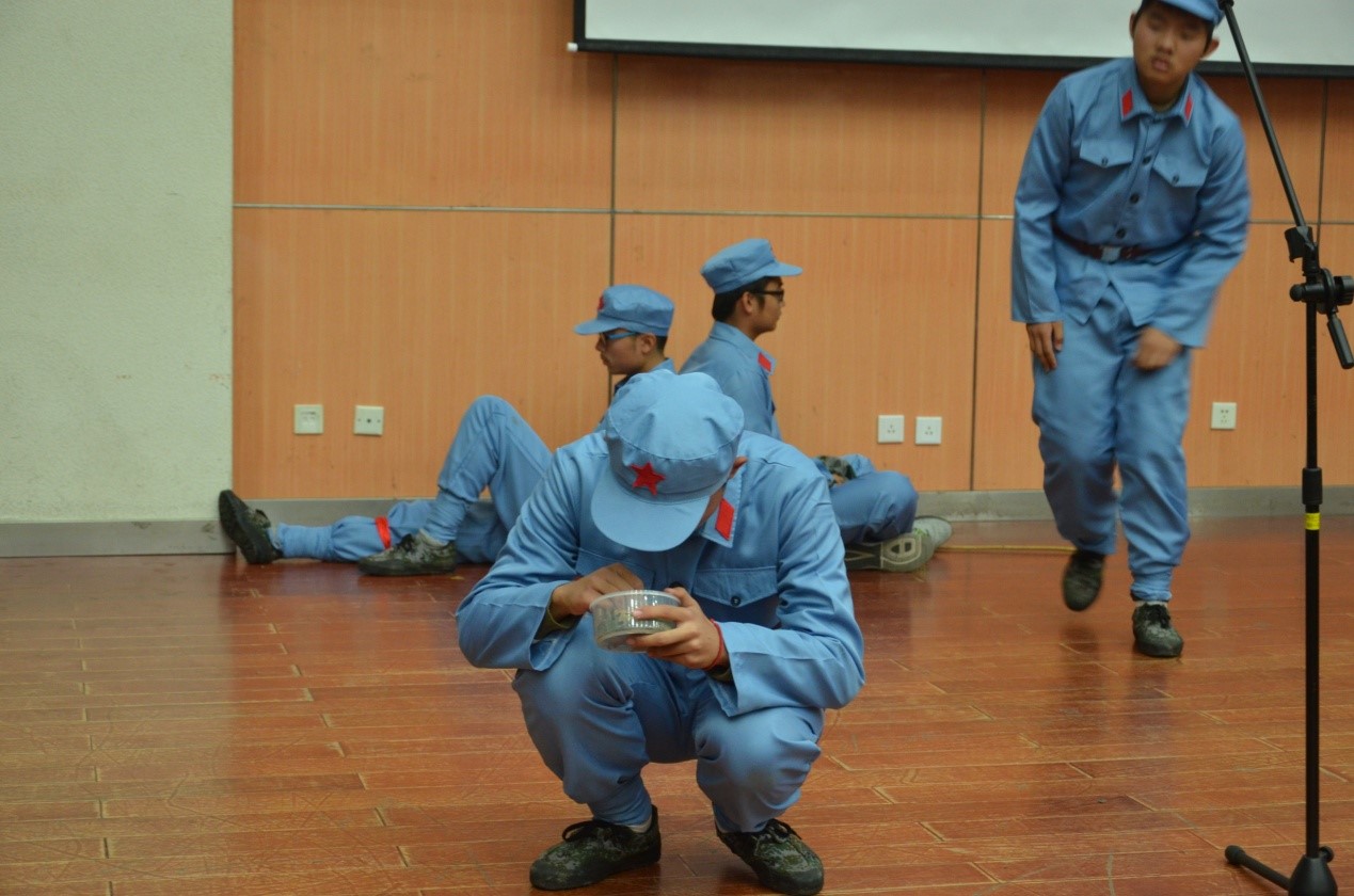 短剧篇章中,同学们再现了《金色的鱼钩》、《大渡河前》的感人情节。短剧《金色的鱼钩》中,老班长躺在地上把最后一口鱼汤让给了年轻的小战士。全场安静了,无不感慨于老班长的慈爱无私、战友情深。短剧《大渡河前》改编自同名电影,同学们身穿军大衣,道具精良。沈队长鼓舞一众战士,激情澎湃;沈队长与老船公对桌而谈,真挚动人;“国民党”持枪怒扫,蛮横霸道。歌颂了红军战士不辱使命,顽强抵抗、团结人民的优秀品质。